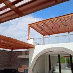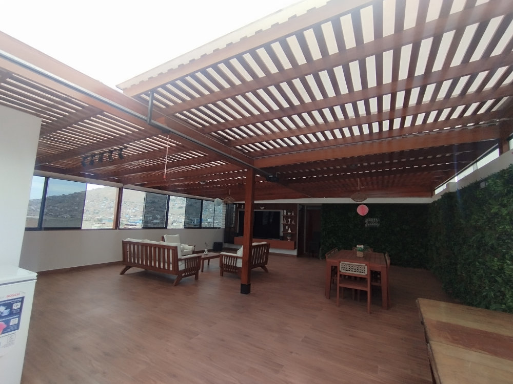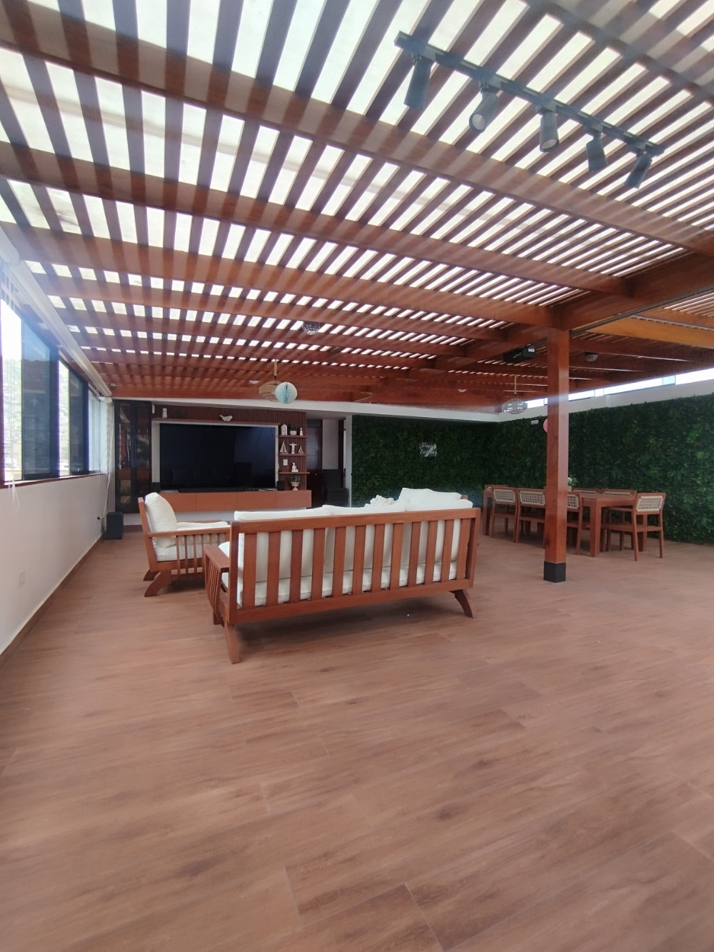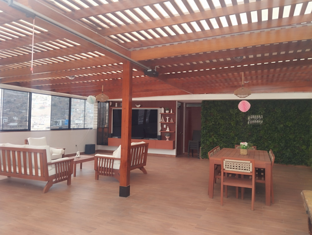 Este es nuestro proyecto de más alta gama, diseñado para ofrecer el máximo confort y flexibilidad. Consistió en la instalación de una amplia pérgola modular en una azotea, donde la sección principal cuenta con un sistema corredizo automatizado. Esto permite al cliente controlar la cantidad exacta de sol y sombra con solo presionar un botón. Se utilizó la prestigiosa Madera Huayruro para garantizar una estética lujosa y una durabilidad superior.