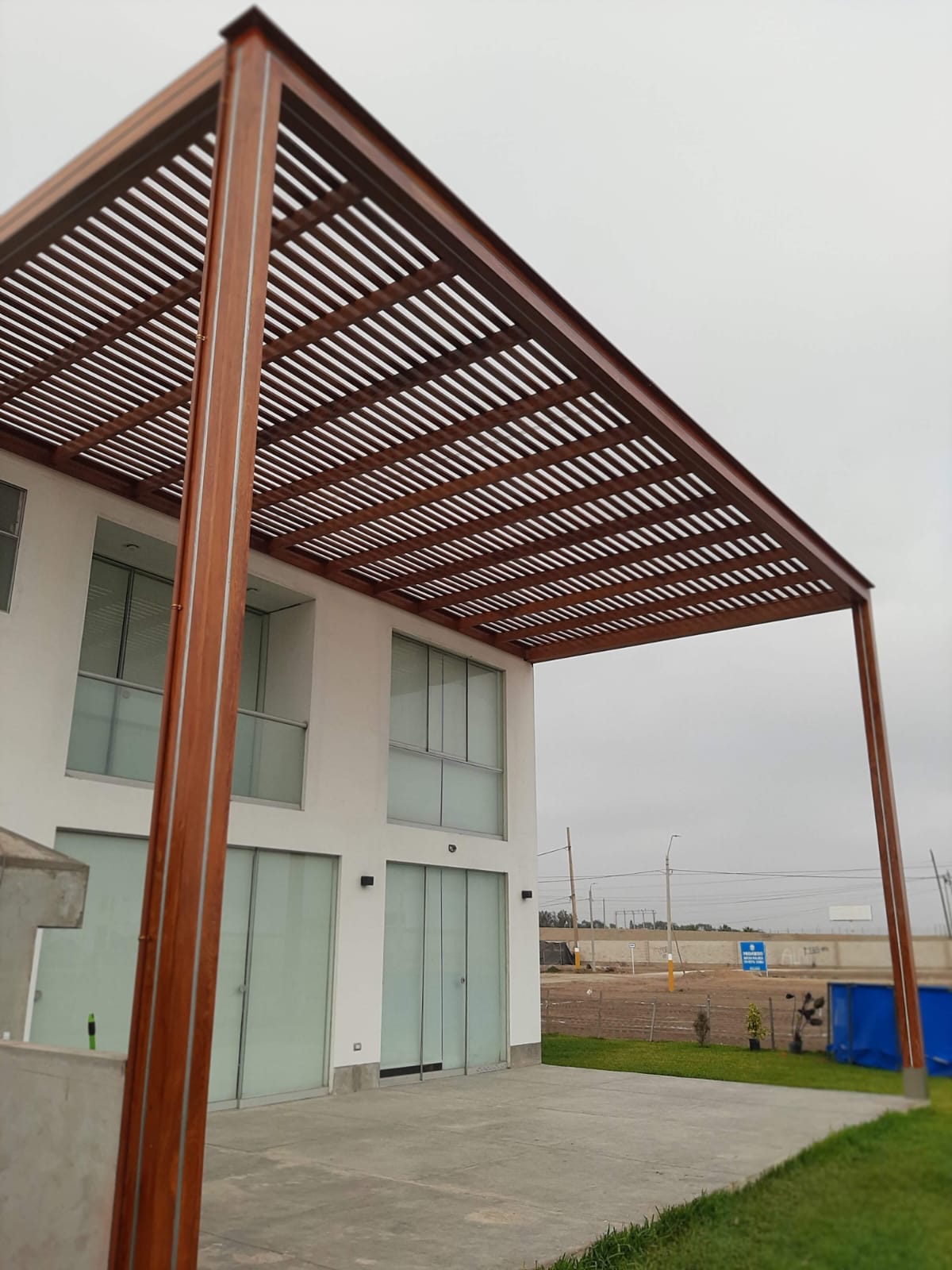 Este proyecto se centró en la creación de una estructura imponente y de diseño atemporal en la fachada de una casa de playa moderna. Se diseñó una gran pérgola fija con voladizo y gran altura, utilizando exclusivamente Madera Huayruro. El resultado es un pórtico exterior que no solo proporciona sombra, sino que añade un toque de lujo, robustez natural y el tono rojizo característico de una madera de alto valor.